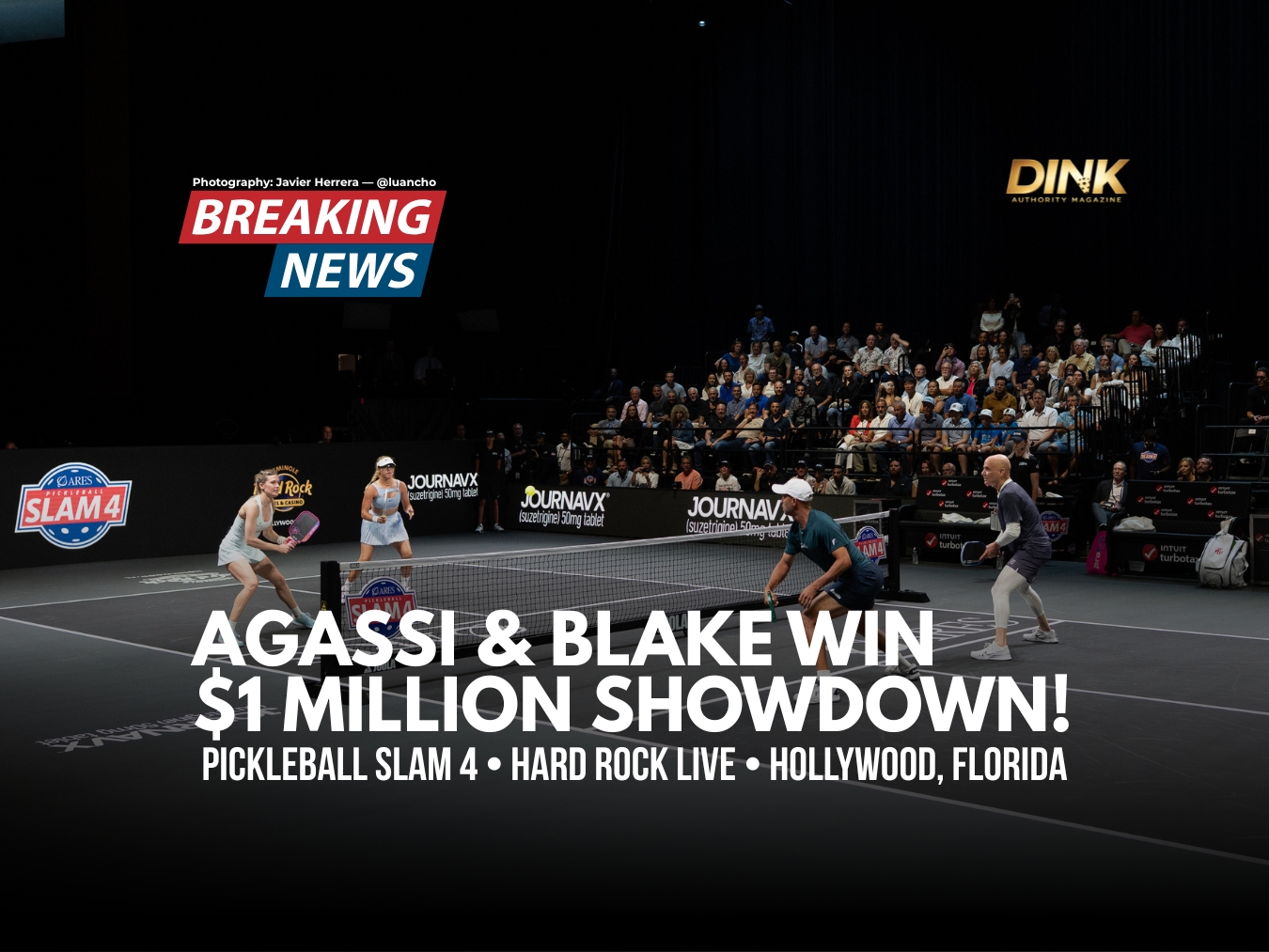 In the decisive doubles match, Agassi and Blake leaned on their experience and competitive instincts to secure the win, ultimately defeating Waters and Bouchard and claiming the Ares Pickleball Slam 4 title with a 3–1 overall result.